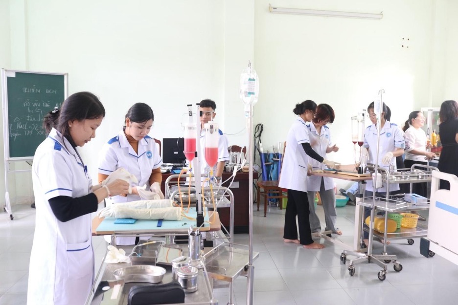 ダナン市医療短期大学の実習室において、学生が健康・医療ケアの実習を行っている様子