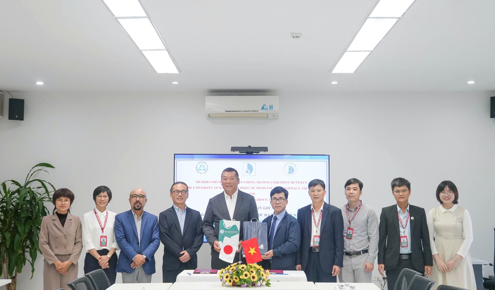 (Trường Y Dược – Đại học Đà Nẵng và Tập đoàn Y tế Aoyama – Công ty TNHH Tư vấn MCHR Nhật Việt chụp ảnh kỉ niệm)